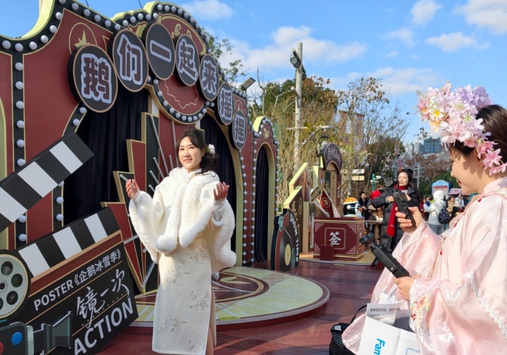 夜间,非遗板凳龙穿梭于极地小镇,八仙过海非遗彩船沿秋莲河巡游。1月1日-1月2日无人机烟花秀营造出浓郁的新年气氛。